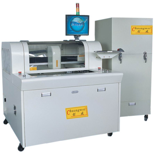 四,銑刀式郵票孔pcb分板機,全自動郵票孔pcb分板機,CW-F01(全自動郵票孔pcb分板機,CW-F01是一臺利用銑刀高速運轉(zhuǎn)將多連片方式的PCB板按預(yù)先編輯好的路徑分割的程式分板機設(shè)備。取代了人工折斷、C-CUT或PUSH的切割瑕疵,提高產(chǎn)品質(zhì)量,減少報廢率,本程式分板機采用人機界面WindowsXP作業(yè)系統(tǒng),簡明而人性化的界面設(shè)計,自動切割路徑校正系統(tǒng),高像素CCD程序制作及區(qū)塊程序和單步程序編輯及修改,兩平臺交互工作的PCB的上下料裝置,能有效地降低機器等待時間,從而達到理想的生產(chǎn)效率。此機型分板應(yīng)力在四種郵票孔pcb分板機中是最小的,通過兩個工作平臺輪流作業(yè),可進行全自動的分板作業(yè)流程。)